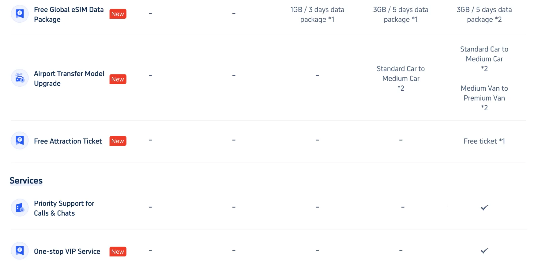 | Peningkatan model pemindahan lapangan terbang* BARU | - | - | - | Kereta standard ke kereta Sederhana*2 | Kereta standard ke kereta Sederhana*2+ Van Sederhana ke Van Premium*2 |