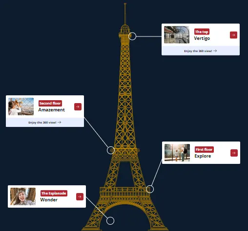 Menara Eiffel terutamanya dibahagikan kepada empat bahagian: Esplanade (lokasi di bawah Menara Eiffel, percuma untuk dilawati), Tingkat Pertama, Tingkat Kedua dan Teratas. Tiket boleh dibeli mengikut tingkat dan kaedah (lif atau tangga) yang anda pergi, dan tiket yang dibeli untuk pameran bangunan juga termasuk akses ke tingkat bawah.Imej dari laman web rasmi Eiffel Tower