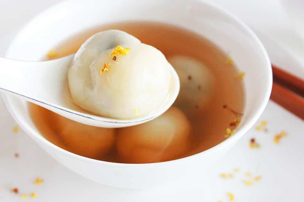 These glutinous rice balls are filled with sesame or peanut paste and served in a fragrant sweet soup made with osmanthus flowers. A seasonal favorite during festivals.