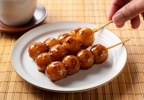 Mitarashi dango is a traditional Japanese sweet made from chewy rice flour dumplings grilled on skewers and coated with a sweet-savory soy glaze. Originating from Kyoto but beloved in Tokyo, it’s a nostalgic treat often enjoyed during festivals or temple visits.