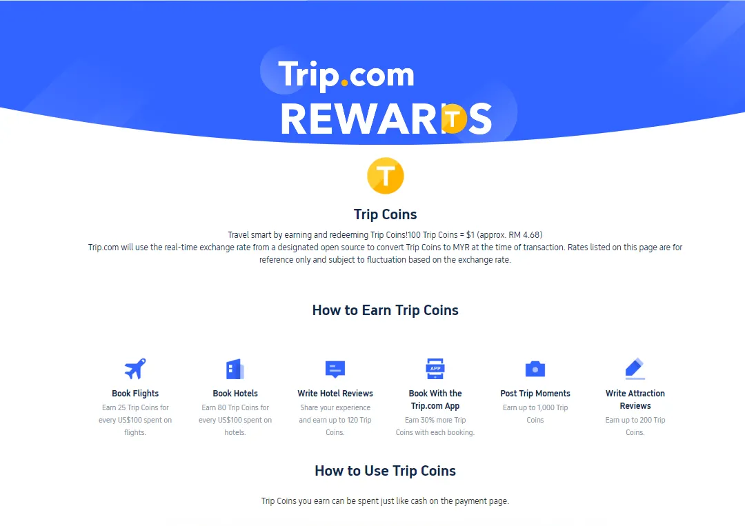 With the Trip.com Rewards, members can earn and use Trip Coins. Every 100 Trip Coins is roughly RM4.68, and it can be used as cash when booking. For instance, spend about RM400 on hotels and earn 80 Trip Coins, or earn up to 120 Trip Coins by sharing hotel reviews.
