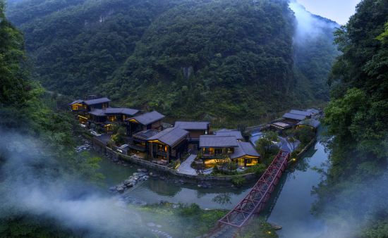 A serene mountain resort surrounded by lush greenery and natural hot springs, perfect for a relaxing escape from the city.