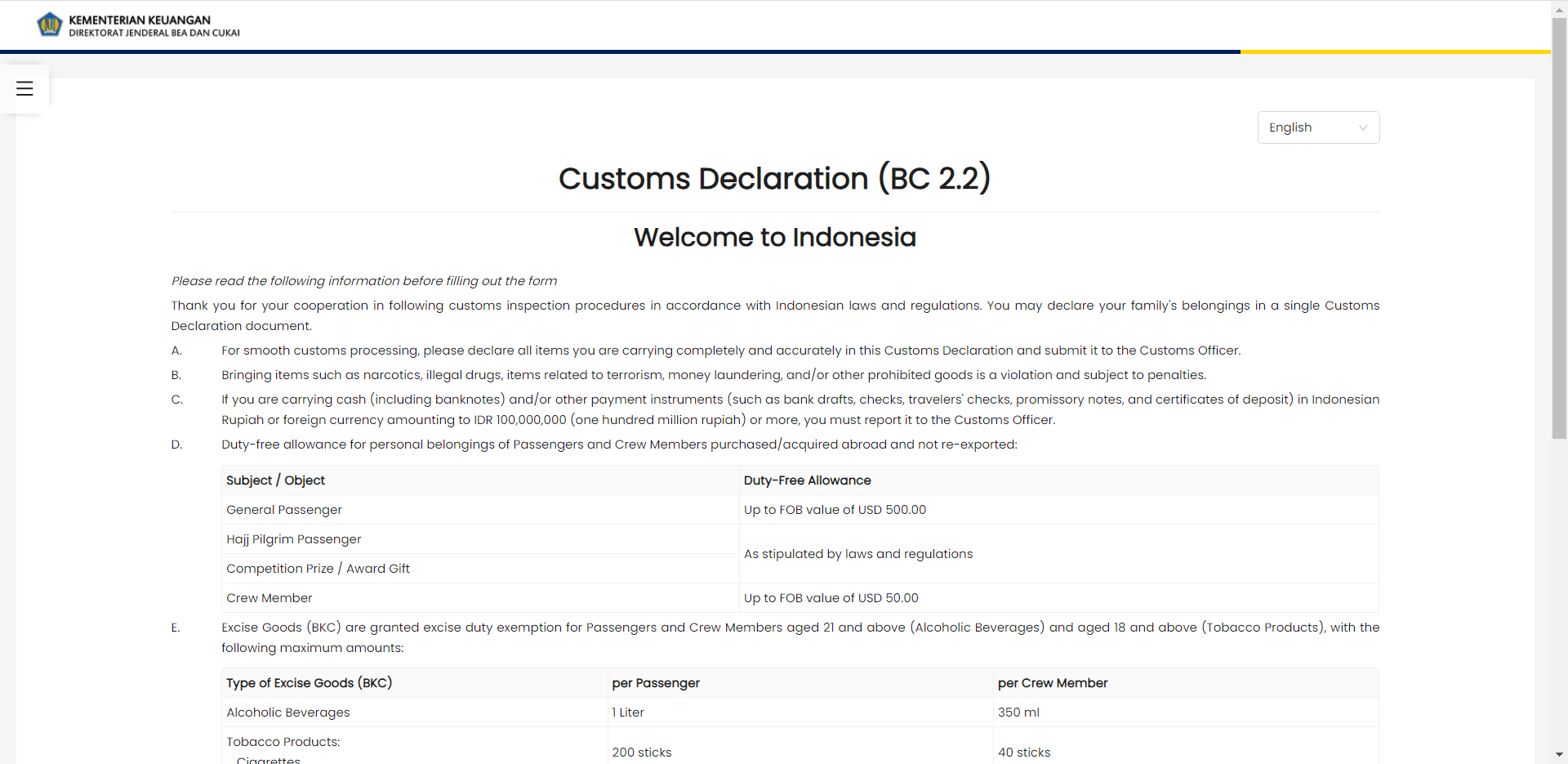 It’s officially called the Electronic Customs Declaration (ECD), and it’s required for all travelers entering Indonesia, regardless of nationality. You need to submit this online customs form before entering the country — it's basically the digital version of the old paper form they used to hand out on the plane.