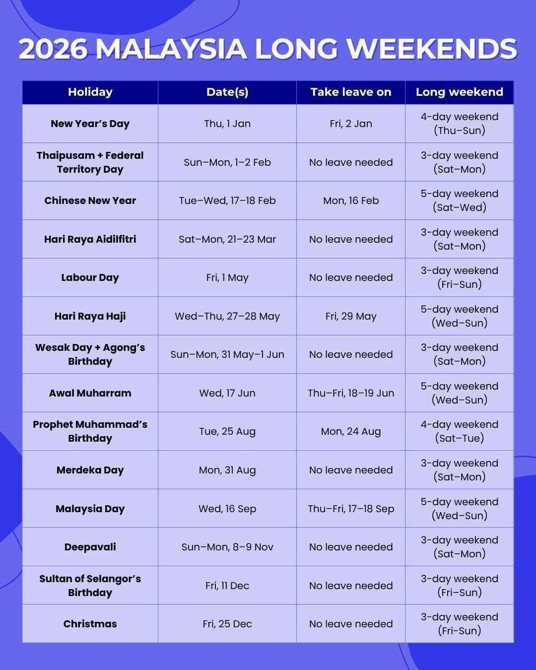 Malaysia Day falls on 16 September 2026 (Wednesday). By taking leave on 17 & 18 September, you can enjoy a 5-day break.8. Can employers replace a public holiday with another day?