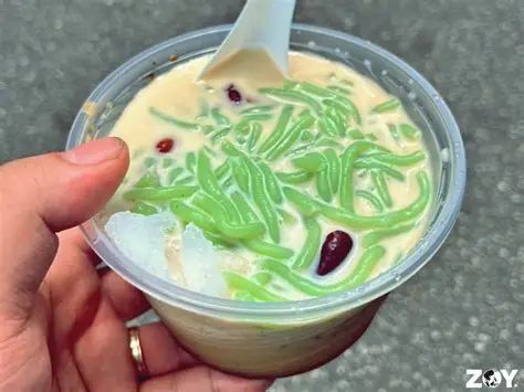 A shaved-ice dessert with coconut milk, palm sugar syrup, and pandan jelly noodles, often with red beans.