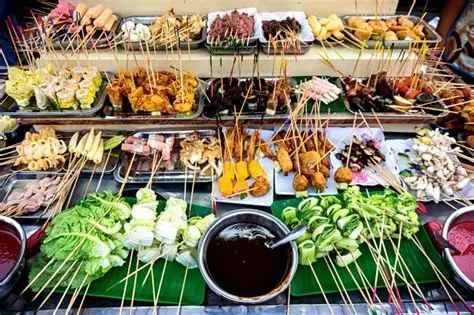 A communal street-food steamboat where diners cook skewered ingredients themselves, then dip in sauces.