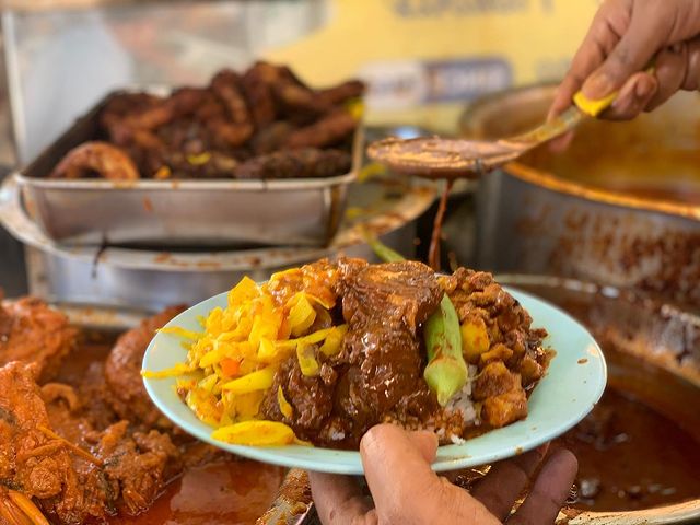 Indian Muslim rice dish from Penang, famous for mixing multiple curries over steamed rice, with meats and vegetables on the side.