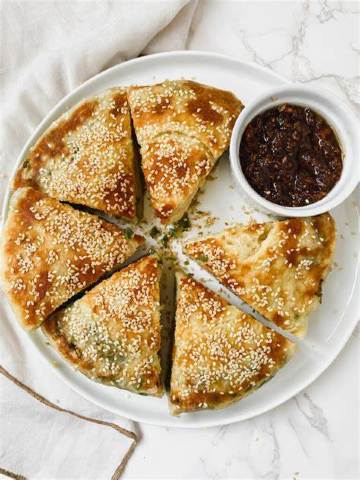 A popular halal snack sold outside mosques and Muslim eateries. It’s pan-fried flatbread filled with sesame paste or seeds.