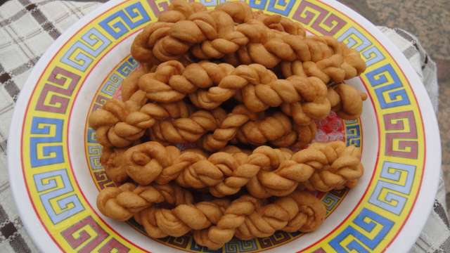 A traditional Muslim snack popular in northern China, made from dough twisted and fried till golden.