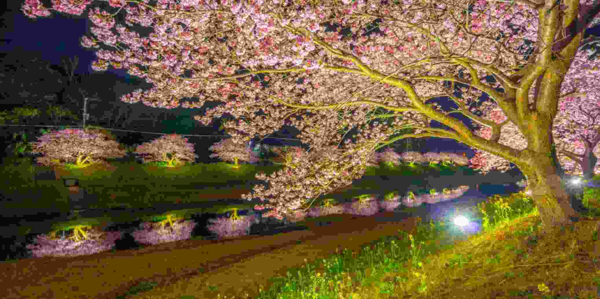 - Cherry blossoms illuminated along the river
