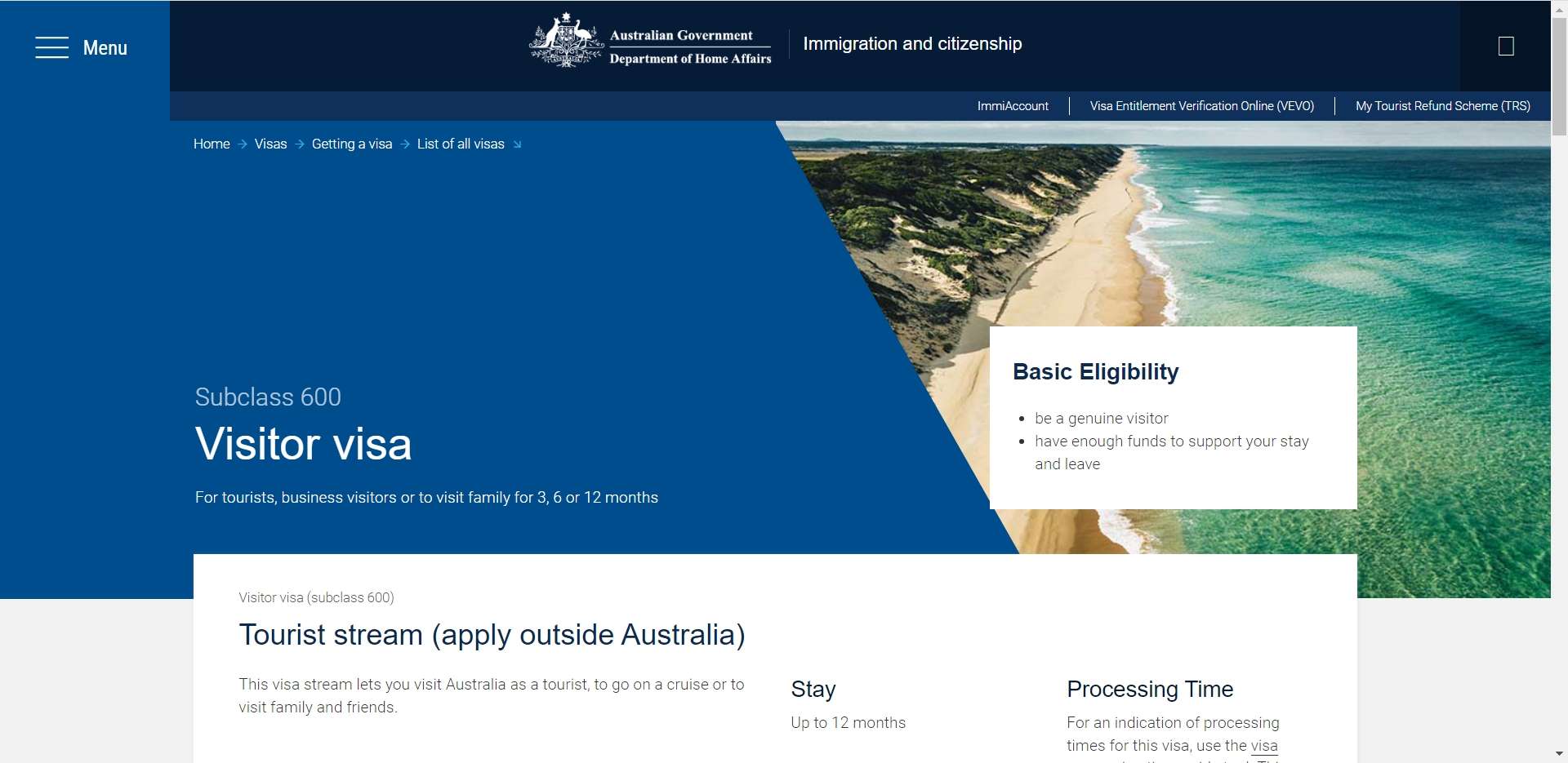 - Pilih aliran yang sesuai (contoh: Tourist stream (outside Australia) atau Business Visitor).
