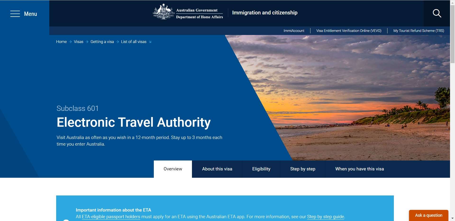 A) Mohon ETA (Electronic Travel Authority) – Subkelas 601