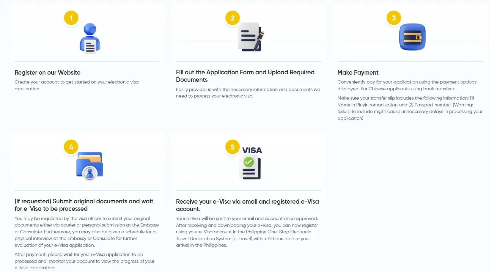 e-Visa anda akan dihantar ke e-mel dan akaun anda setelah diluluskan. Selepas menerima dan memuat turun e-Visa anda, anda kini boleh mendaftar menggunakan akaun e-Visa anda dalam Sistem Perisytiharan Perjalanan Elektronik Sehenti Filipina ((e-Travel) dalam masa 72 jam sebelum ketibaan anda di Filipina.