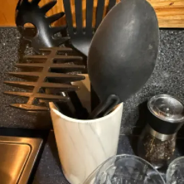 The kitchen utensils are complete but the cleanliness is average, and the countertops feel greasy.