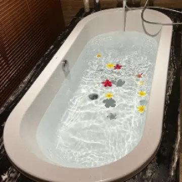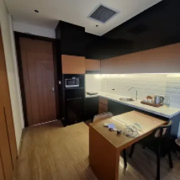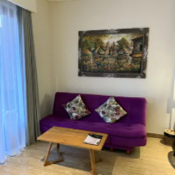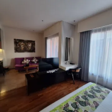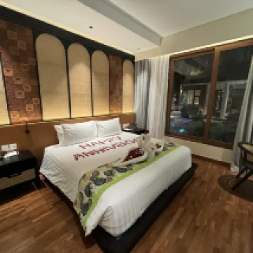 No regrets selecting this small boutique hotel. 3 floors, served by elevator. The room was bright and beautiful. Kitchenette/dining area. Kettle, coffee/tea, bottled drinking water, refrigerator, induction hotplate and basic cutlery/crockery provided. A 3 seater sofa and coffee table in the sitting area. The king bed that we had was so comfortable and firm. The bathroom was luxurious. A separate shower room, separate WC room, a separate section with vanity counter/wash basin and luxurious bath-tub. The staff were so attentive. They noticed that it was my daughter's birthday, and surprised her with a birthday cake when we came down to the lobby. The hotel is situated in a small alley road. Very quiet and peaceful. Convenience shops, are just a stone's throw away. Otherwise, expect to use Grab taxi, or Grab ride frequently. Not much night life and activities in this part of Kuta. Except for Batubelig beach about 15mins stroll away, which is dotted with bars with outdoor beach seating, where you can catch the beautiful sunset.