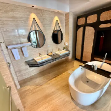 A beautiful modern spacious room with huge proportions providing open plan kitchen and living room space leading to the very large private infinity pool and sun bathing deck area. Sliding doors lead to the spacious bedroom with huge 4 poster bed and adjoining large indoor ensuite bathroom, roll top bath, separate shower wet room and toilet area and twin sinks. We had high hopes and this accommodation even exceeded expectations, The hotel pool was a great addition for shared sun-bathing and swimming whilst the hotel restaurant and bar area provided optional food and drink if required. Walking distance from the local shops, bars and restaurants there were plenty of options and nearby supermarkets and laundry facilities providing everything needed within easy reach. Staff were welcoming, polite and attentive.