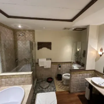 The room was spacious and very comfortable, but perhaps the drainage was poor after a shower; even with the shower curtain up, the unit-type bathroom flooded all the way to the toilet. It remained that way even after the shower. That was a bit disappointing, considering we had booked a suite...