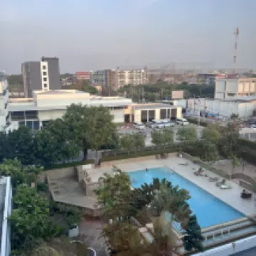 Nice Swimming pool and dining room areas. The room was on the 6th floor which required stairs to access. There was no hot water in the shower.