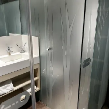 1) The bathroom/toilet is separated by a glass door. The glass door is a bit sagging, does not open and close smoothly, and is poorly designed.