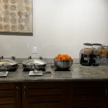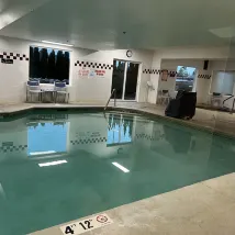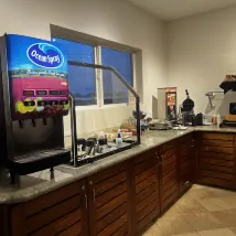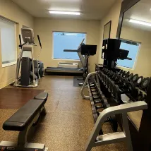 Unfortunately, this hotel had no staff to service us when checking-in. The room was nice but carpets need cleaning. The weight room is totally torn out and the swim pool could use some maintenance In the morning there was no hot food to eat. The milk was warm for the cereal but the bagels were nice.