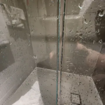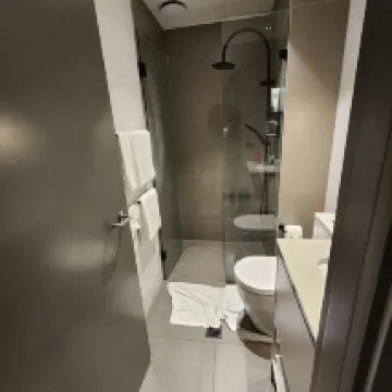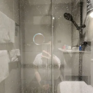 1. The bathroom is quite small. The glass shower door has a hole where the handle is, and there's no rubber seal between the two glass panels. You have to be very careful not to point the shower head towards the door when showering, otherwise, water will spill out.