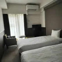 No cleaning services, you leave used towels in an open basket outside the door to exchange for new towels which is very unhygienic. Walking 15-20 minutes to tenjin or hakata station. Reception very unfriendly and rude, she is not willing to help nor answer any questions. Rooms very small, requested for 2 beds but they are put together and almost no space to separate them. Can only open 1 luggage at a time. Not much space to put luggage