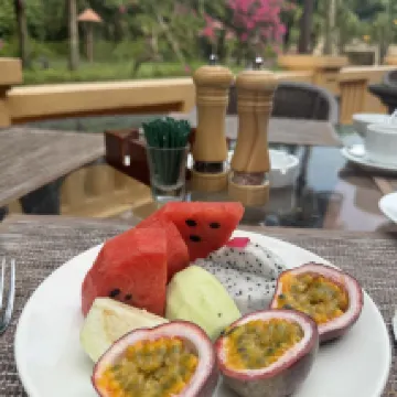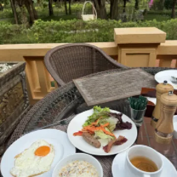 what a wonderful hotel, spacious room with nature decor style, balcony in a garden, bathroom with bathtubs connected to an outdoor shower, dinner in restaurant serving fresh ingredient, vegetable so fresh, breakfast ok, didn’t try bakery cos looks like not so good, may be I’m wrong, spa service super good with very good price, highly recommend, for those love garden, floral and nature, should try this hotel, photos show breakfast