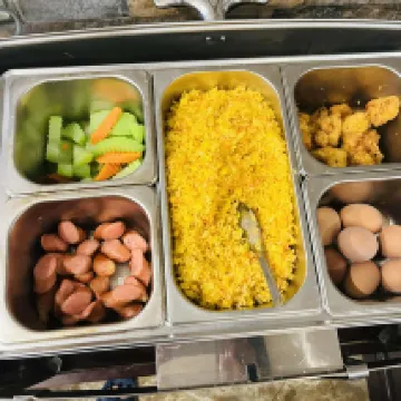 They provide complimentary water, coffee, and tea, and breakfast is included. However, the breakfast spread is the same every day, and the bread is already pre-toasted, so it’s cold by the time you get to the small dining area. If you come down late, there’s usually not much food left.