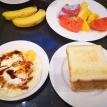 Breakfast starts at 6:30 and includes rice noodles, pasta, sausages, fried eggs, fruit, etc. The fried eggs are usually served quickly, which is a plus. The hotel's location is easy to find and convenient for getting around. The downside is that there was hair on the sheets, which made it seem less hygienic.