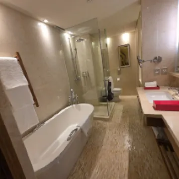 The room's decor and color scheme were wonderfully soft and inviting! The pillows were very comfortable, and the bathroom felt luxurious. They even provided complimentary aromatherapy toiletries, which were a real sleep aid! A big thumbs up!