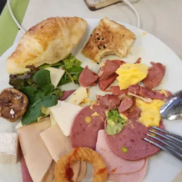 The hotel is in a great location, right in the center, but there's a downside: a tram right outside the window. The staff and breakfasts are very nice, everything feels homey. The room has radiators, not just an air conditioner for warmth. Breakfast was slightly different every time over the three days. Everything was delicious. The hotel left a very warm impression.
