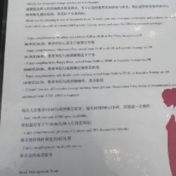 Executive Privileges: For an executive room, I was surprised there was no welcome fruit, let alone the chocolates I'd seen others share online. The afternoon tea selection was truly disappointing; it’s genuinely the first time I've encountered spicy peanuts and gummy bears in a 5-star executive lounge. The coffee machine's cappuccino setting didn't dispense properly for the cups, and the staff weren't familiar with its operation either, so I just ended up with two cups of hot milk. The only redeeming quality was the late check-out, which I appreciated.
