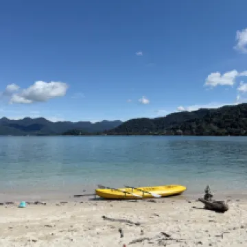Amazing scenery! It's quiet and peaceful, perfect for a family getaway to escape all your worries! They offer paddleboarding, and you can even paddle directly to the secluded beach on the island across the way. The rooms are a bit old, so definitely try to stay in the main building! The view from the breakfast restaurant is absolutely incredible, comparable to the nearby observation deck!
