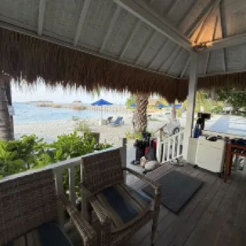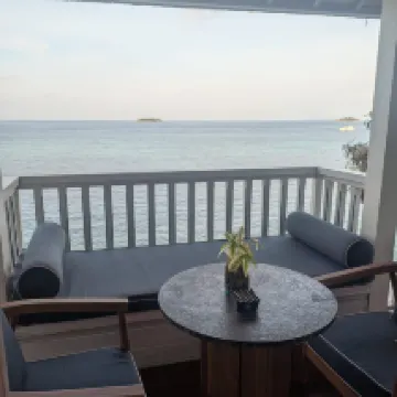 Private beach hut, right on the sea. There's an open-air balcony in the room, and the shower is also outdoors, so you can't shower if it rains. The room is very traditional, with a key instead of a key card or code lock. There's no cell signal in the room, and while there's Wi-Fi, the hotel changes the password every morning, so you have to ask for it yourself. Snorkeling is right off the hotel's pier beach; there's no supervision, you just go on your own. You can rent life jackets, masks, and snorkels for free, but there's no instruction or lifeguard. Overall, it's pretty good! The underwater scenery is beautiful!