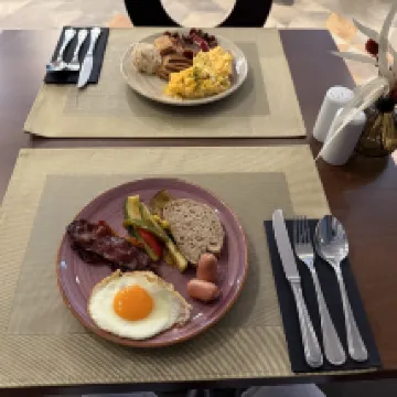 The breakfast was truly the highlight of our stay. The buffet spread was extensive, with something for everyone. From a cereal and nuts bar to a coffee station offering filter coffee and a variety of fresh juices, the options were endless. There was a cheese and meat section, a wonderful selection of breads, omelettes, sausages, fried eggs, bacon, chia pudding, fresh fruits, and even lemon-infused water. Everything was absolutely delicious—easily the best buffet breakfast we've ever had. Typically, buffet breakfasts can be a bit underwhelming, but this one was in a league of its own.