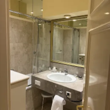 This was the fifth hotel on my trip to Switzerland. It's two bus stops from the train station, but conveniently located right by the stop, so getting there wasn't an issue. The hotel clearly exudes a rich history and old-world charm, with its luxurious European-style decor. I had a bit of trouble initially finding the right entrance and the front desk within the building. I'd actually booked a city view room, but the front desk upgraded me to a stunning lake view room – seriously, you *must* book a lake view! The terrace views were absolutely breathtaking!! The room itself wasn't huge, but it did have air conditioning. The bathroom was a tad small, mainly due to a large, rather useless cabinet taking up unnecessary space.