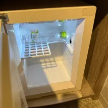 Additionally, the shower head in the bathroom couldn’t be adjusted in height, which was inconvenient. The mini fridge was not properly cleaned, as we found a previously opened bottle left inside.