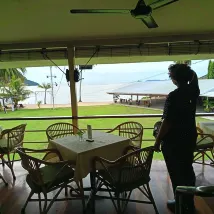 The location is actually quite good, offering beautiful sunset views. The restaurant is adorned with photos of the owner and their family, chronicling their lives, which gives the place a real sense of history and charm. However, the hotel is quite old and could use a renovation. At night, the bathroom was full of mosquitoes and bugs. Also, the beach area by the hotel becomes muddy during low tide. If it were renovated, it would truly be a wonderful place. The hotel owner is an elderly gentleman who, upon seeing our suitcase was a bit stuck, even asked his staff to get tools to help us fix it. A big thumbs up to him for his kindness!