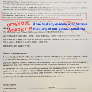 Total exclusion of smokers! Only one place is given in the corner, totally prohibiting and annoying being forced at check-in to sign that only if they think or find evidence that you smoked on the balcony or elsewhere in the hotel you will be fined 3,000 baht. It's not the amount, it's the way they manage the presence of smokers. !!!!!!!