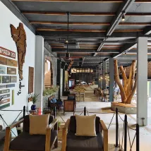 this hostel is like 3 mins to 5 minutes walk from the main road. you can just walk going to the temple and beaches. all of the staff are so nice. the room was clean they even have swimming pool. they have the laundry area . free delicious and healthy breakfast.