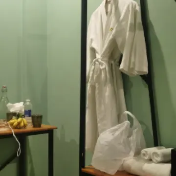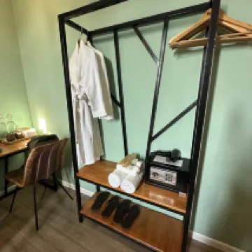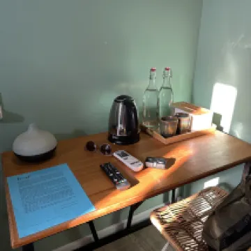 It's clean, smells pleasant, has kind staff, bathrobes, an aroma diffuser in the room, a clean kettle, and drinking water in the common area.