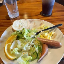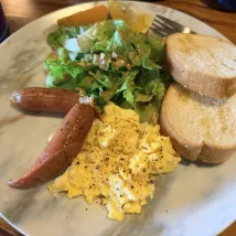 Breakfast is served at a branch restaurant; it's a simple Western breakfast with eggs, sausages, salad, and bread.