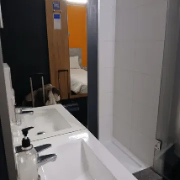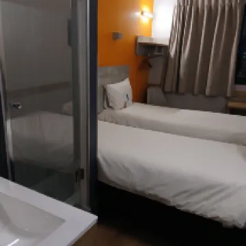 The space is tight and the bathroom is a mobile bathroom. The bathroom is not ventilated and has no windows. A simple and fast hotel.