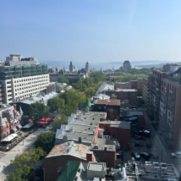 The room was very clean and comfortable. The location is excellent, right next to the Plains of Abraham and the bar street. Parliament Hill is also very close. You can walk everywhere. The view from the room window is fantastic. However, the air conditioning is old and very noisy. Why wasn't the room cleaned on the second day? Is that common practice here?