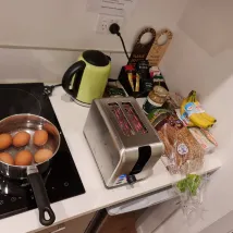 Self catering was good with basics. We had a faulty fridge and had just bought supplies but the hotel, although almost time for staff to leave, found us another room with an upgrade. If you are a fussy camper, you could say fittings in bathroom were "cheap" and scuff marks on walls (all white so they show more) but it was perfect for us. Overlooking building sites and other buildings but just look up and there are the mountains in their splendour.l Cost was reasonable and as parking is pricy in Queenstown it was good to get free parking at the hotel.