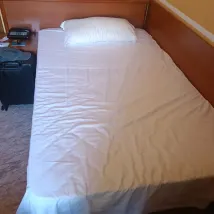 The room itself was decent and adequate for the 2 of us. The bed, unfortunately, was hard and the pillows flat. The bidet was situated directly in front of the shower! In order to get into the shower, you had to walk between the toilet and bidet, then squeeze between opening the glass door and wall to enter the tub. The shower head was useless as it was clogged with lime scale. So we resorted to using the handle only.