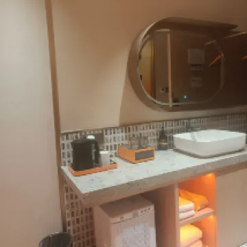 This hotel truly understands what young people want! The warm orange ambient lighting creates such a fantastic atmosphere, and the plush bedding ensures a great night's sleep. The bathroom, with its sleek geometric tiles and stylish countertop basin, adds a touch of modern sophistication, and they even included a gaming controller! Thoughtful touches like the cozy window-side seating area and mini-fridge are much appreciated. The black and white floor tiles and clever lighting design make the space incredibly photogenic. Staying here felt like having my own chic and cool urban pad. Every detail of the service was impeccable, making the overall experience absolutely fantastic! 👍