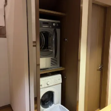 **Facilities:** There's a washing machine with a dryer, which is super important for family trips lasting more than 3 days. The room also comes with a foldable drying rack. Plus, there's a large fridge, a microwave, and a full set of dishes and cooking utensils. Besides the main bedroom, the sofa in the study on the second floor is a sofa bed, and the sofa in the living room downstairs is also very large, so you could actually sleep four people. There's a big balcony too; if the weather isn't too hot, you can slide open the two glass doors and enjoy the breeze.