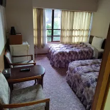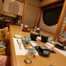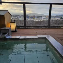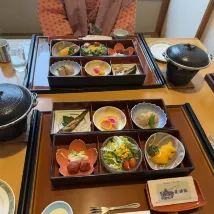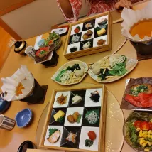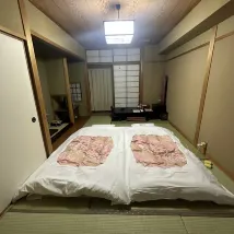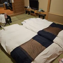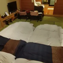 The hotel is located on a mountain, so you can get there from the station by taxi (about 1,500 yen) or call the hotel in advance to be met. They will take you back to the station. The hotel minibus runs every 30 minutes until 10 am. A beautiful onsen, very clean, conveniently planned. In the women's section there are 3 ponds, two of which are outdoors, one of them is a jacuzzi. At 5 pm I was alone. In the men's section, as my husband said, there are also 3 ponds, also beautiful. And of course shampoos, gels, etc. hair dryers, everything is available. It's funny to walk around in yukatas, which are given out at the hotel. Dinner is kaiseki, very beautifully presented. As is breakfast. But the food is not ours, but it was very interesting. I would not say that the room is large. But the futons, in my opinion, are uncomfortable. After the onsen you want to lie down, and the futons are spread out while you are having dinner. You have to sit - it's uncomfortable. So you choose a room with regular beds. As an experience, one day is enough.