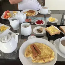 Все чисто , на затравки яичница , сосиски , тосты и фрукты